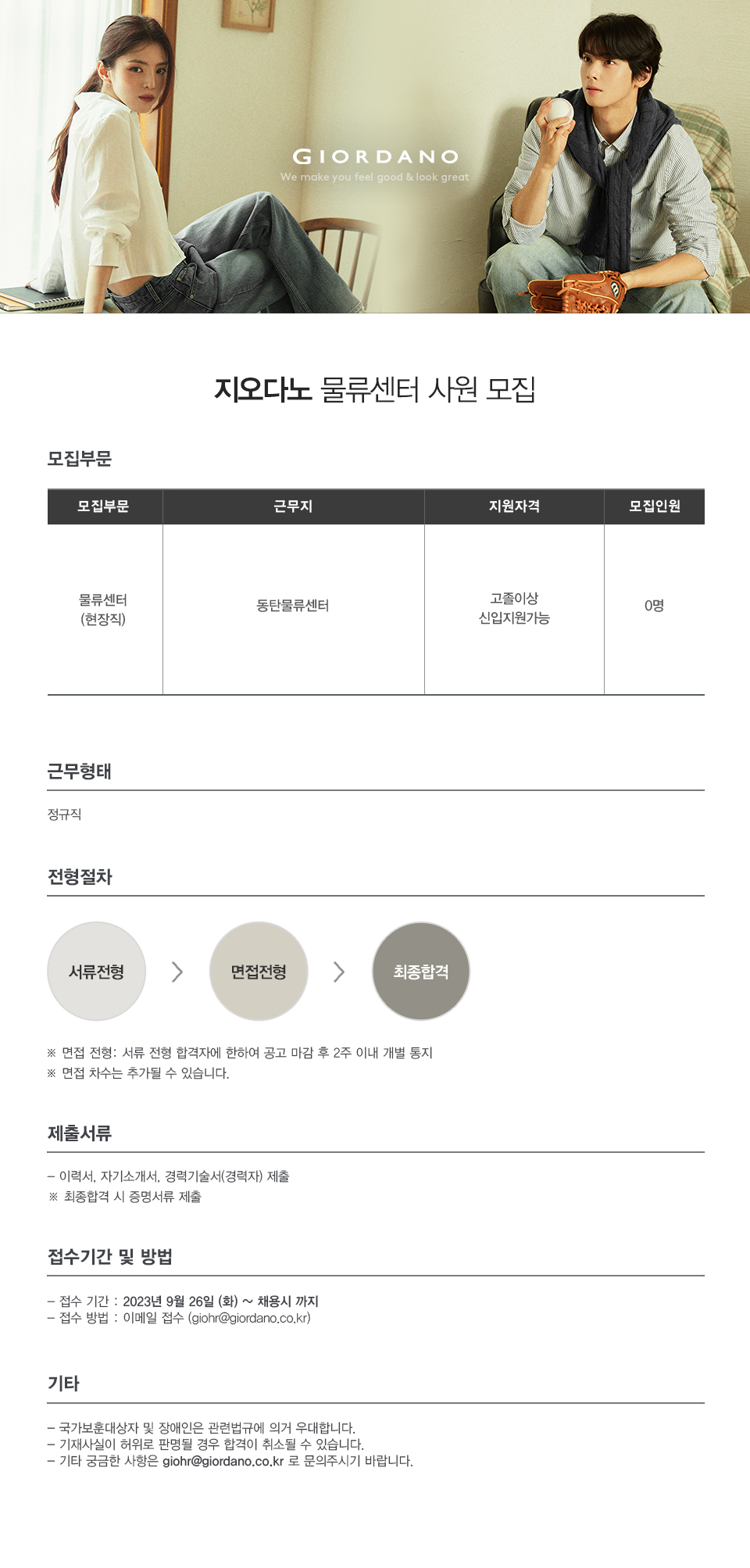 ※ 서류전형 합격자에 한해 면접 일정 관련 내용 연락 드립니다. ※ 필요에 따라 면접차수는 늘어날수 있습니다. ※ 지원방법 : 이메일 접수 (giohr@giordano.co.kr)