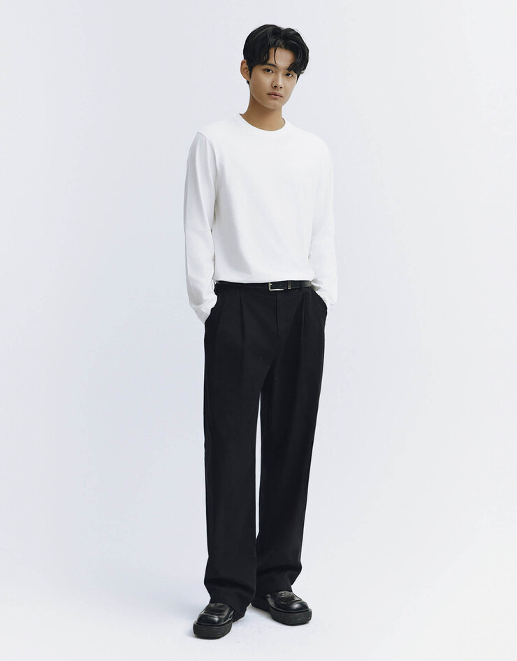 플리츠 포인트가 돋보이는 와이드핏 치노 팬츠입니다.