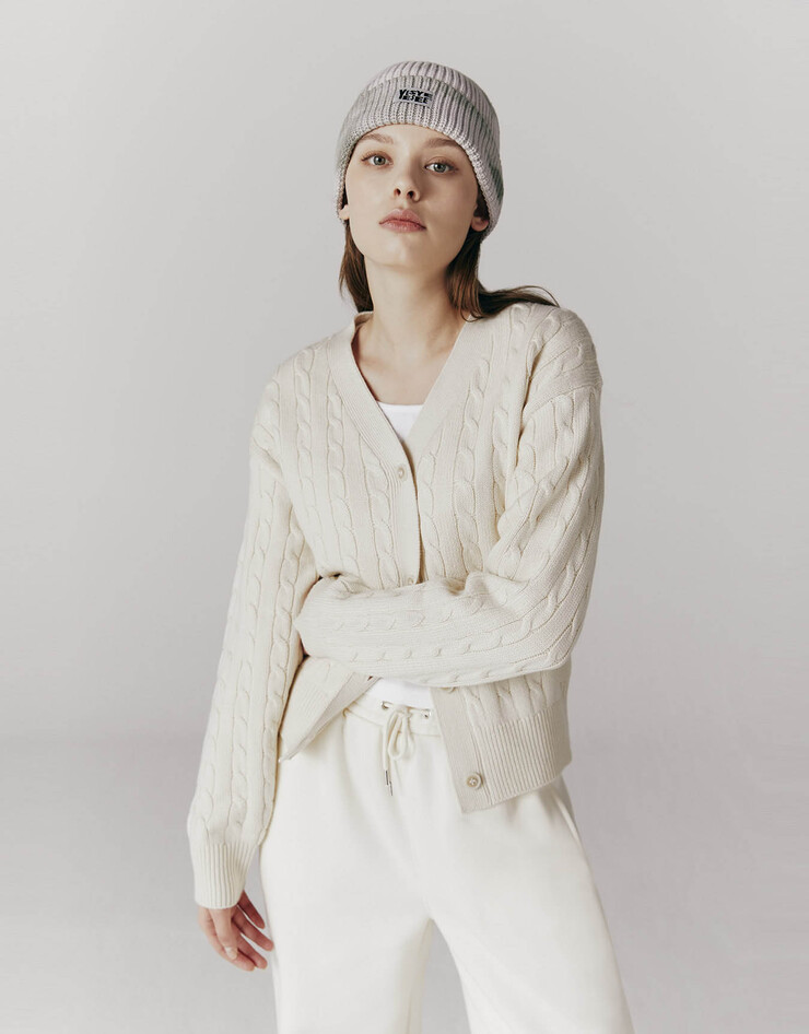 케이블 조직이 더해진 클래식한 무드의 5GG 울혼방 브이넥 가디건입니다.