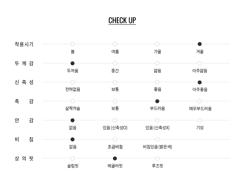 네크·밑단·소매단은 1×1 더블 립으로 마무리해 안정적인 핏으로 마무리했습니다.
