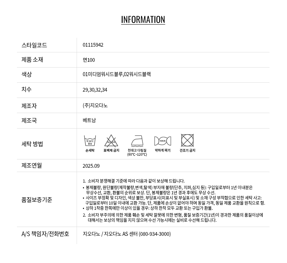 **데님 염료의 특성상 이염 및 물빠짐이 불가피하므로 반드시 미지근한 물에 뒤집어서 단독 세탁하시기 바랍니다.