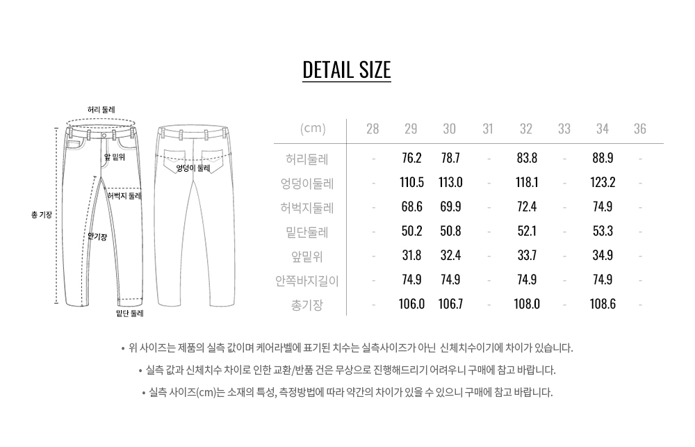 **데님 제품의 경우 워싱 가공 특성상 제품 별 디테일의 편차가 있을 수 있습니다.