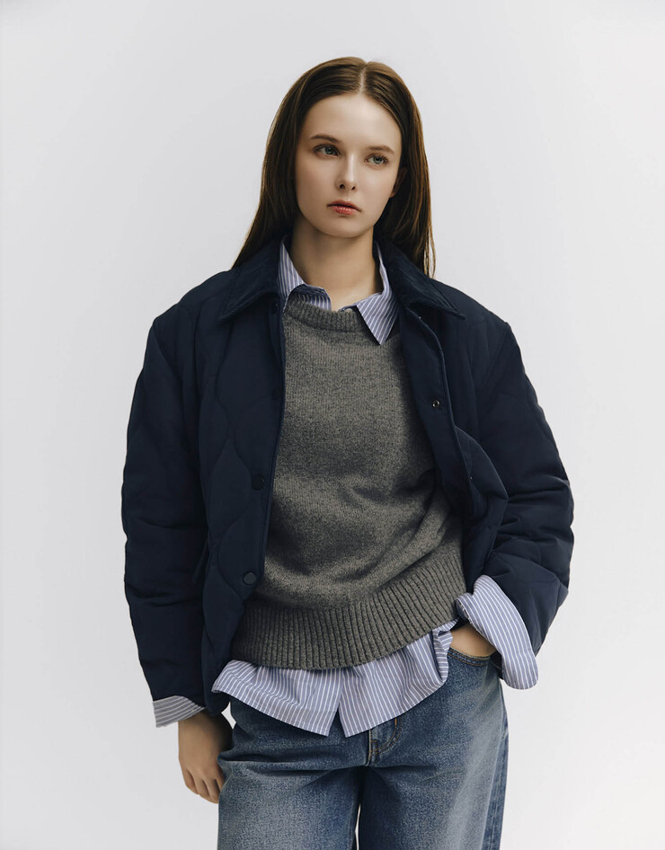 윗힙을 살짝 덮는 기장감으로 전체적으로 여유감이 느껴지는 오버핏 실루엣의 퀼팅 자켓 입니다.