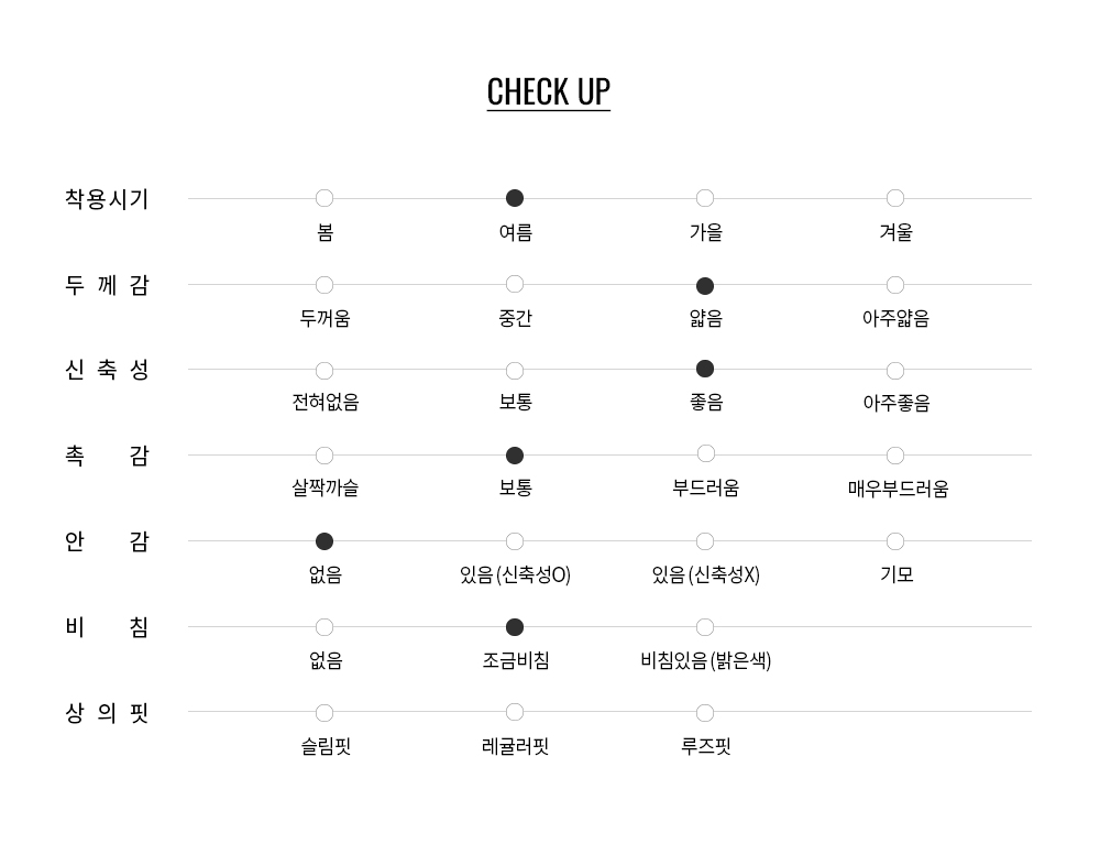 성글하게 짜인 텍스처가 특징이며 피부에 닿는 드라이한 터치감으로 무더운 날씨에도 쾌적함을 유지해주며, 은은하게 비치는 시어한 질감이 레이어링의 즐거움을 더해줍니다.