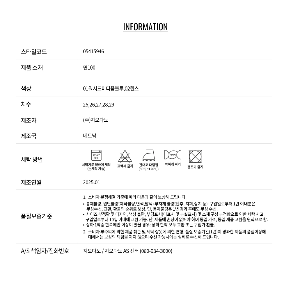 **데님 염료의 특성상 이염 및 물빠짐이 불가피하므로 반드시 미지근한 물에 뒤집어서 단독 세탁하시기 바랍니다.