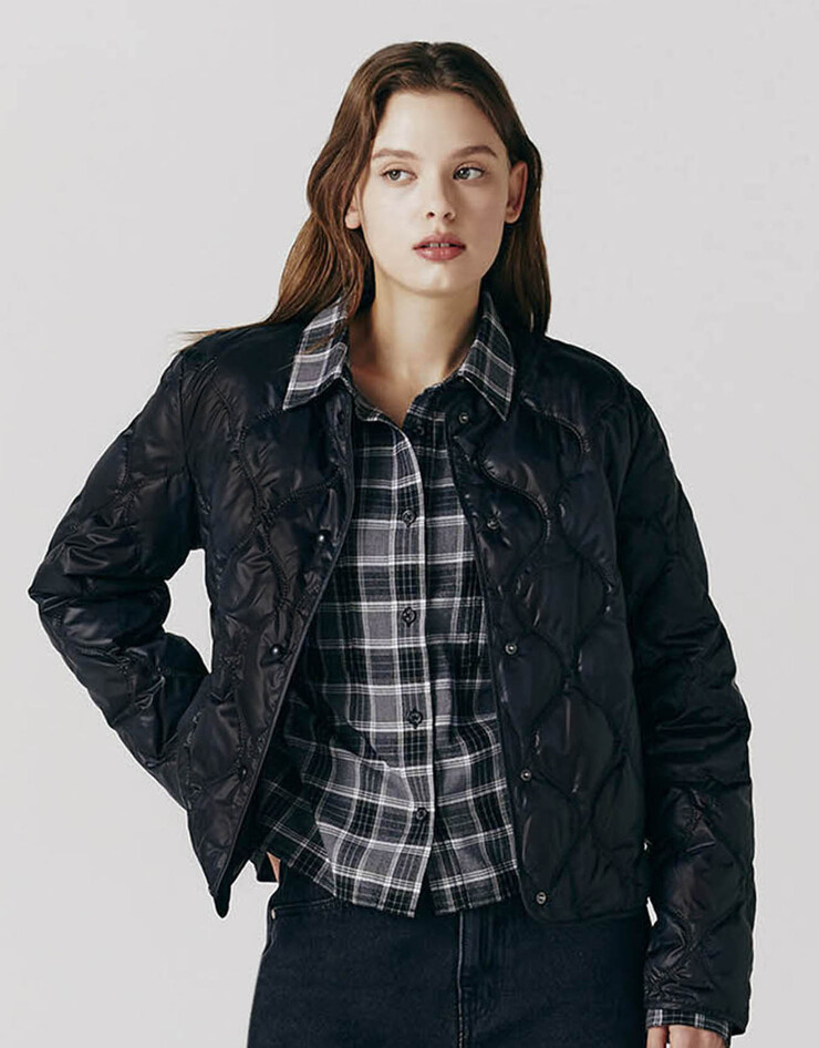 몸판 전체에 스치티가 두 줄로 업데이트 된 더블 어니언 퀼팅으로 여성스러우면서도 캐주얼한 느낌을 주며 네크라인과 앞여밈, 소매, 밑단에 바인딩 처리가 되어 있는 경량다운 기본 크루넥 자켓입니다.