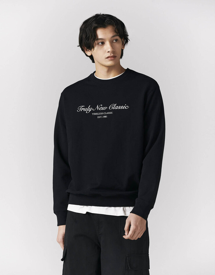프렌치 테리 소재의 그래픽 크루넥 풀오버 스타일입니다.
