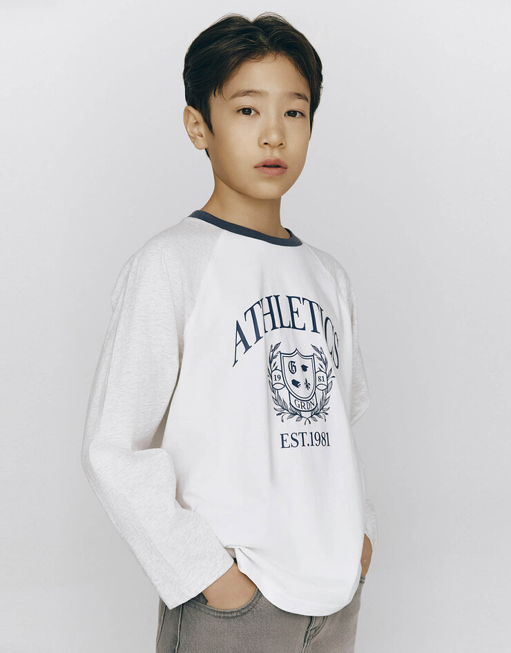 가을 시즌 입기 좋은 라글란 소매의 그래픽 티셔츠 입니다.