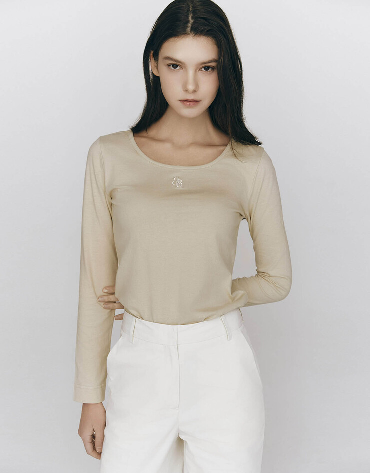 스쿱넥 디자인으로 여성스럽고 세련된 느낌을 주며, 자연스럽게 떨어지는 실루엣이 특징입니다. 가슴 중앙에 톤온톤 자수