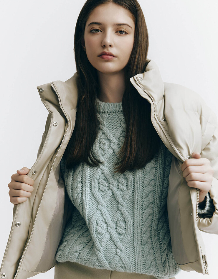 전체적으로 여유있는 오버핏 실루엣에 미니멀한 무드가 느껴지는 트렌드한 숏 푸퍼로