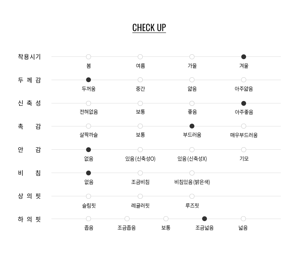 320GSM의 적절한 중량으로 한겨울에도 안정적인 보온성을 제공하며, 안감의 기모 처리로 피부에 닿는 감촉이 부드럽습니다. 세탁 후에도 형태 변형이 적고 관리가 용이해 데일리 팬츠로 활용도가 높습니다.
