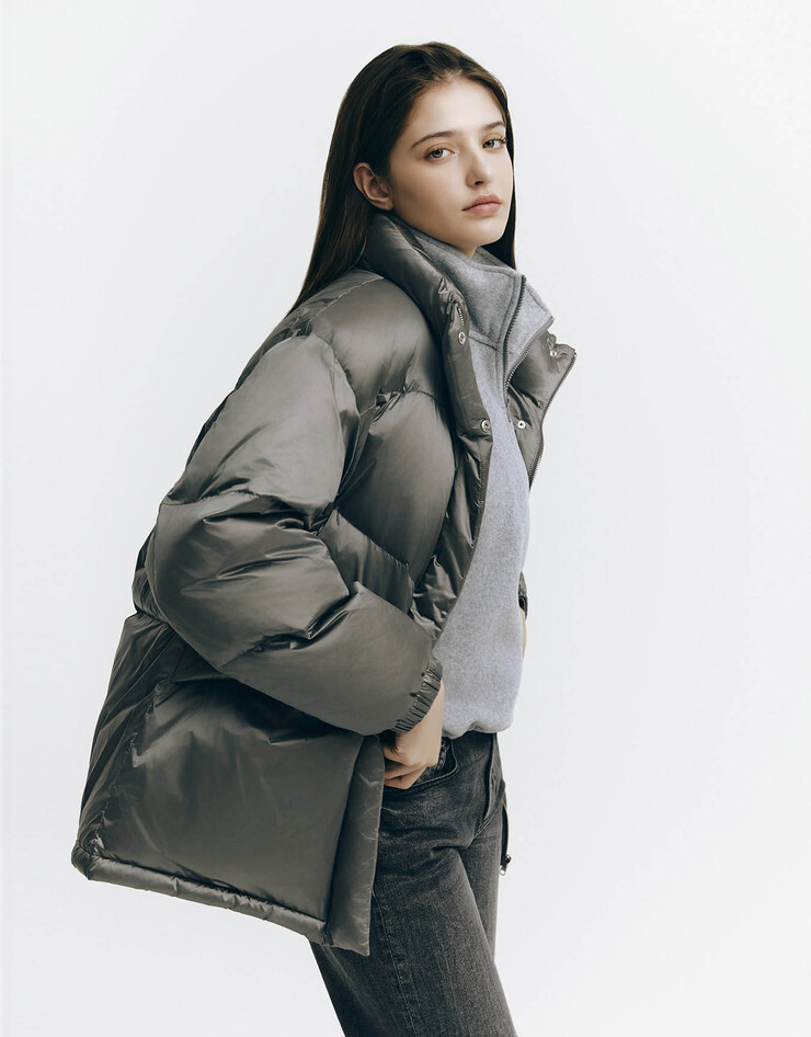 힙을 덮는 미들랭스 기장으로 전체적으로 여유감이 느껴지는 박시한 오버핏 실루엣의 푸퍼입니다.