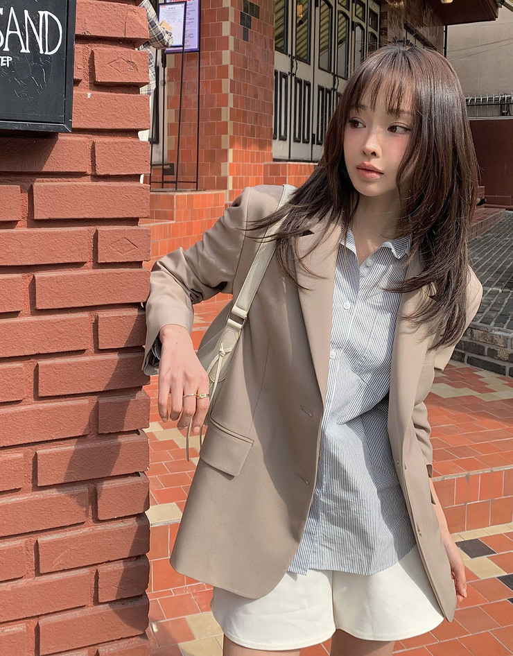 오버핏 어깨라인의 블레이저의 트렌드한 실루엣으로 기존 블레이져 라인보다 좀 더 여유롭고
