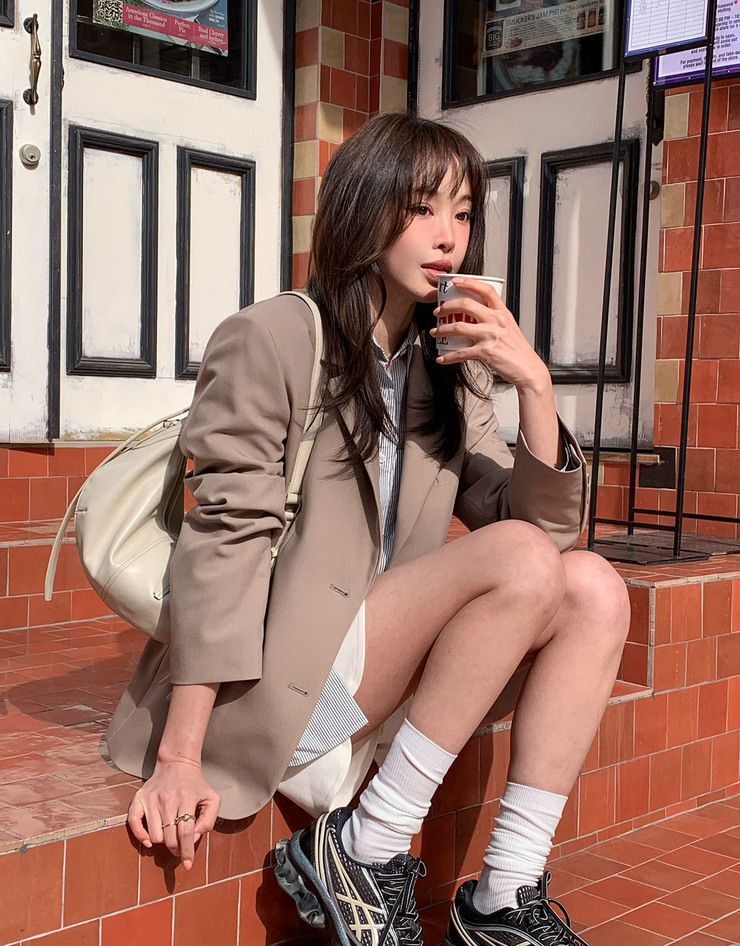 오버핏 어깨라인의 블레이저의 트렌드한 실루엣으로 기존 블레이져 라인보다 좀 더 여유롭고