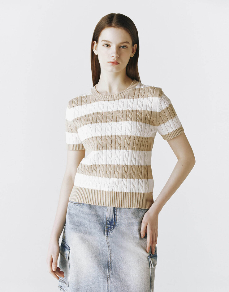 케이블 패턴의 클래식한 무드가 느껴지는반팔 스웨터입니다.
