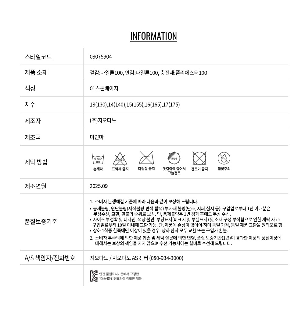 겉감은 매트한 질감의 나일론 소재를 사용해 고급스러운 터치감을 더했으며, 충전재는 SYNCLOUD SOFT SORONA를 사용하여 가볍지만 보온성이 뛰어나며, 오래 착용해도 변형이 적고 안정감 있는 핏을 유지할 수 있습니다.