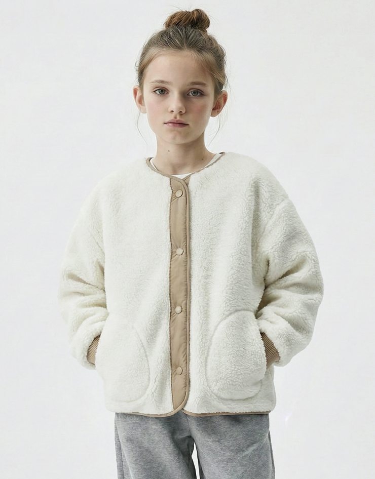 한 면은 후리스고 되어 있고 반대쪽은 얇은 경량패딩으로 되어있어 양면으로 다양하게 활용 가능한 리버서블 자켓입니다. 살짝 내려온 브이넥 라인으로 답답하지 않게 입으실 수 있으며, 업데이트된 퀼팅라인으로 세련된 스타일링이 가능합니다. 얇은 패딩과 후리스가 양쪽으로 있어 보온성을 더욱 높였습니다. 스냅으로 된 앞여밈으로 어린이가 스스로 열고 닫기에 용이합니다. 후리스가 앞으로 입으실 때에도 앞부분 플라켓에 배색 컬러와 귀여운 모양의 주머니 디테일로 부해보이지 않고 포인트가 됩니다.