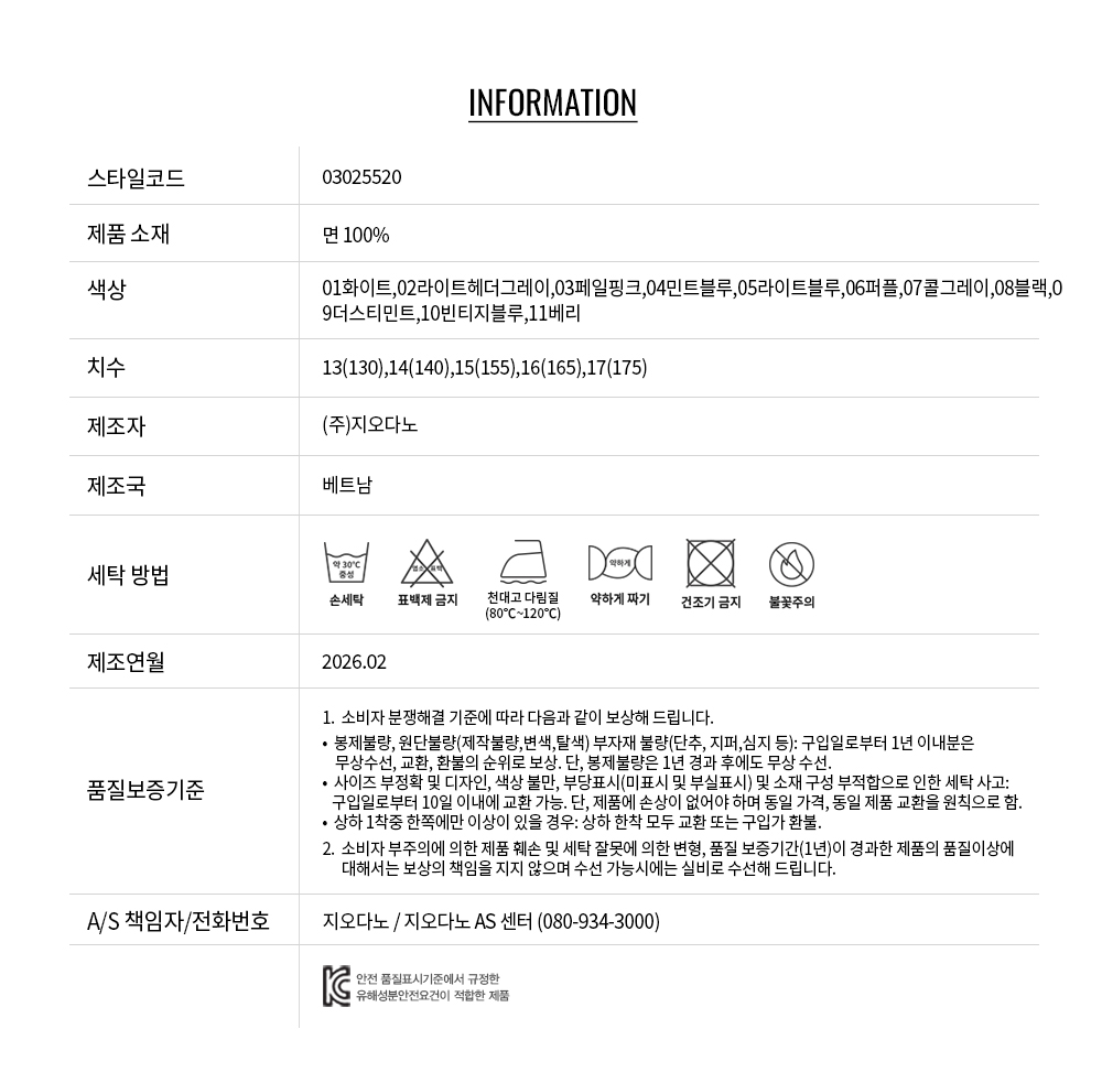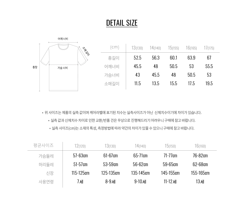 면 100%의 20수 205g/m2 (245g/yd) 중량감의 저지원단을 사용하여 땀흡수에 뛰어나고 세탁이 용이하며, 부드러운 촉감으로 어린이들에게 입히시기에 좋습니다.