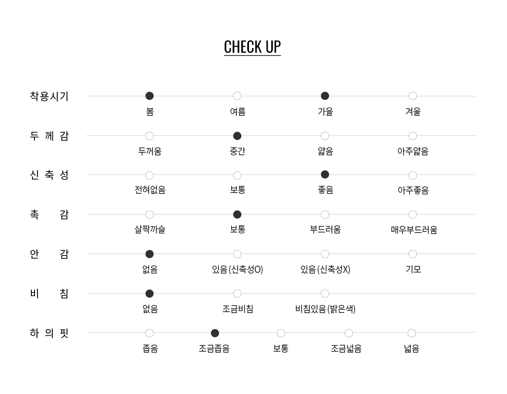 봄 시즌 셔츠, 니트, 가디건 등 다양한 상의와 손쉽게 매치하여 트렌디한 데일리룩을 연출할 수 있습니다.