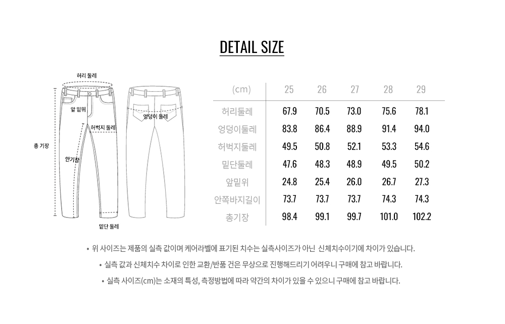 * 데님 제품의 경우 워싱 가공 특성 상 제품별 디테일의 편차가 있을 수 있습니다.