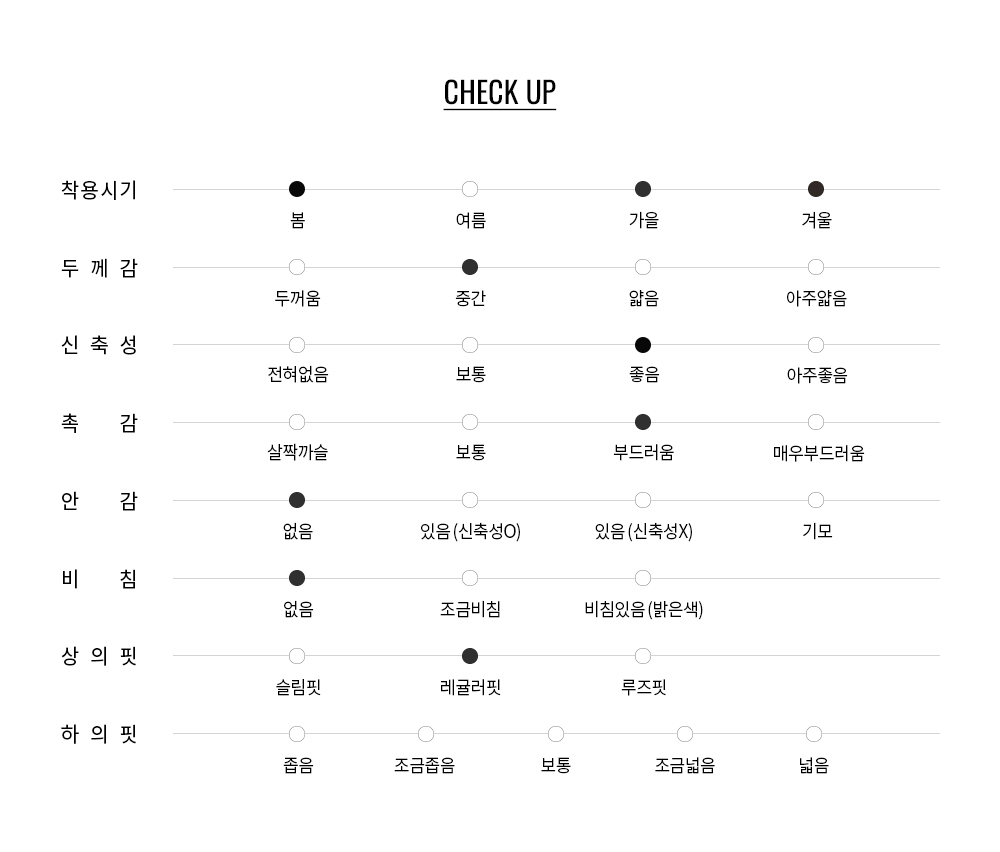 두께감 있는 원단으로 비침이 적고 안정적인 실루엣 연출이 가능합니다.