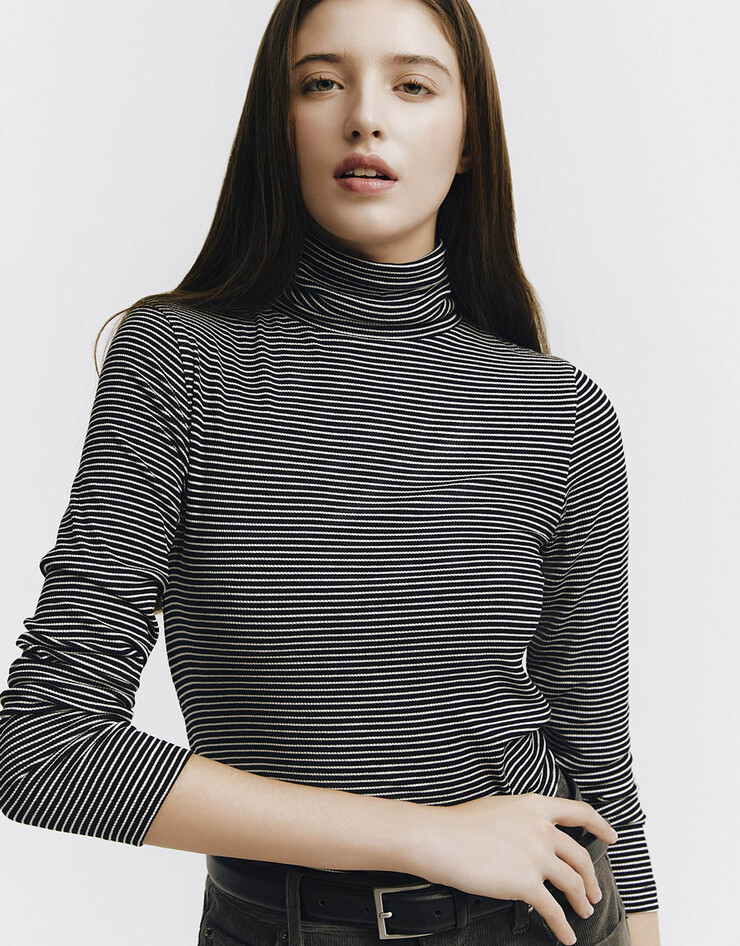 여유 있게 제안된 터틀넥 디자인으로, 착용 시 자연스러운 주름 연출이 가능하며 2X2 립 조직에 몸에 핏되는 실루엣으로