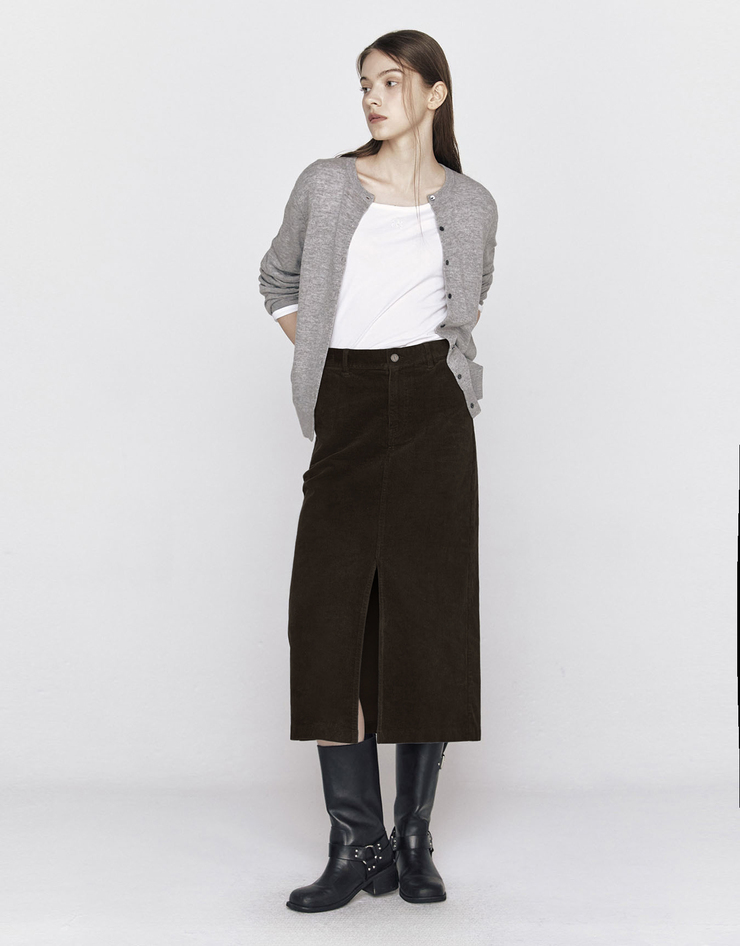 허리와 힙 라인은 슬림하게 잡아주면서, 밑단으로 갈수록 살짝 A-line으로 벌어지는 실루엣으로 앞에 슬릿 디테일을 더하여 편안한 착용감을 제공합니다.