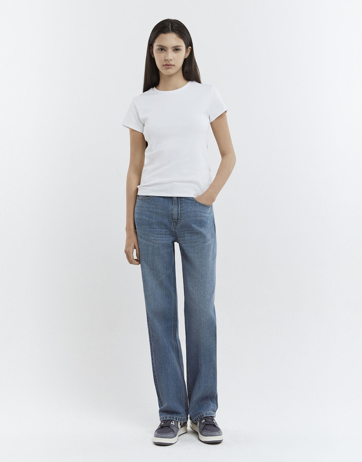 허리부터 힙까지 슬림하게 잡아주고, 허벅지부터 밑단까지 일자로 떨어지는 스트레이트 핏 데님으로