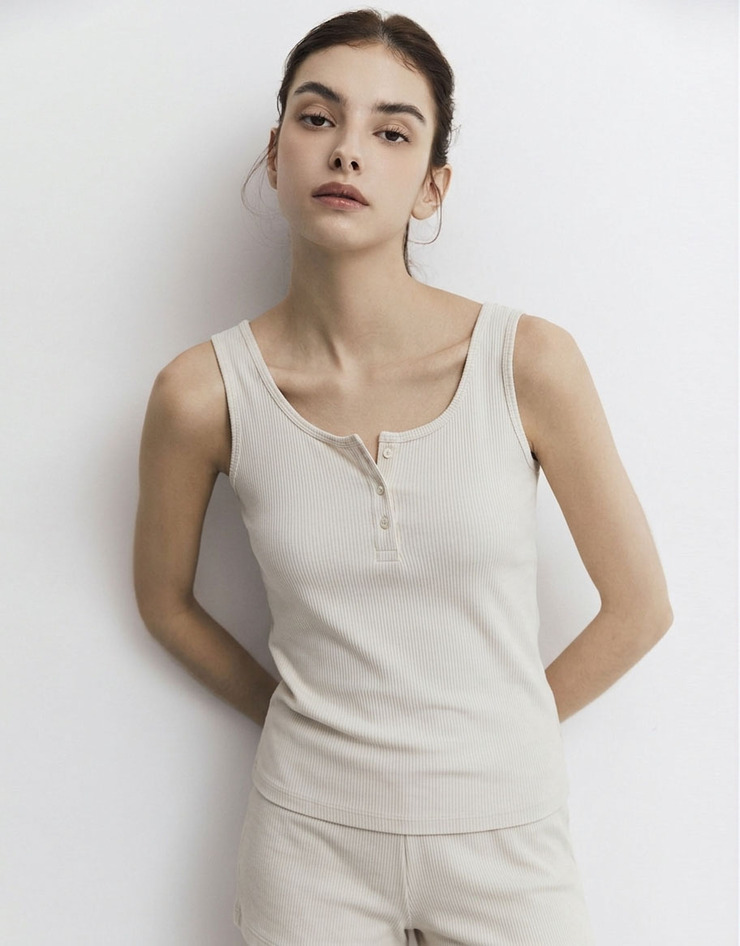 넥과 암홀 바인딩 마감으로 내구성을 높였으며, 동일 소재 하의와 셋업으로 스타일링이 가능합니다.