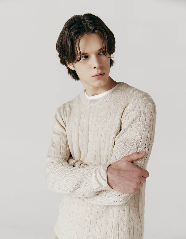 메리노울 블렌드 원사로 부드럽고 고급스러운 케이블 크루넥 풀오버입니다.