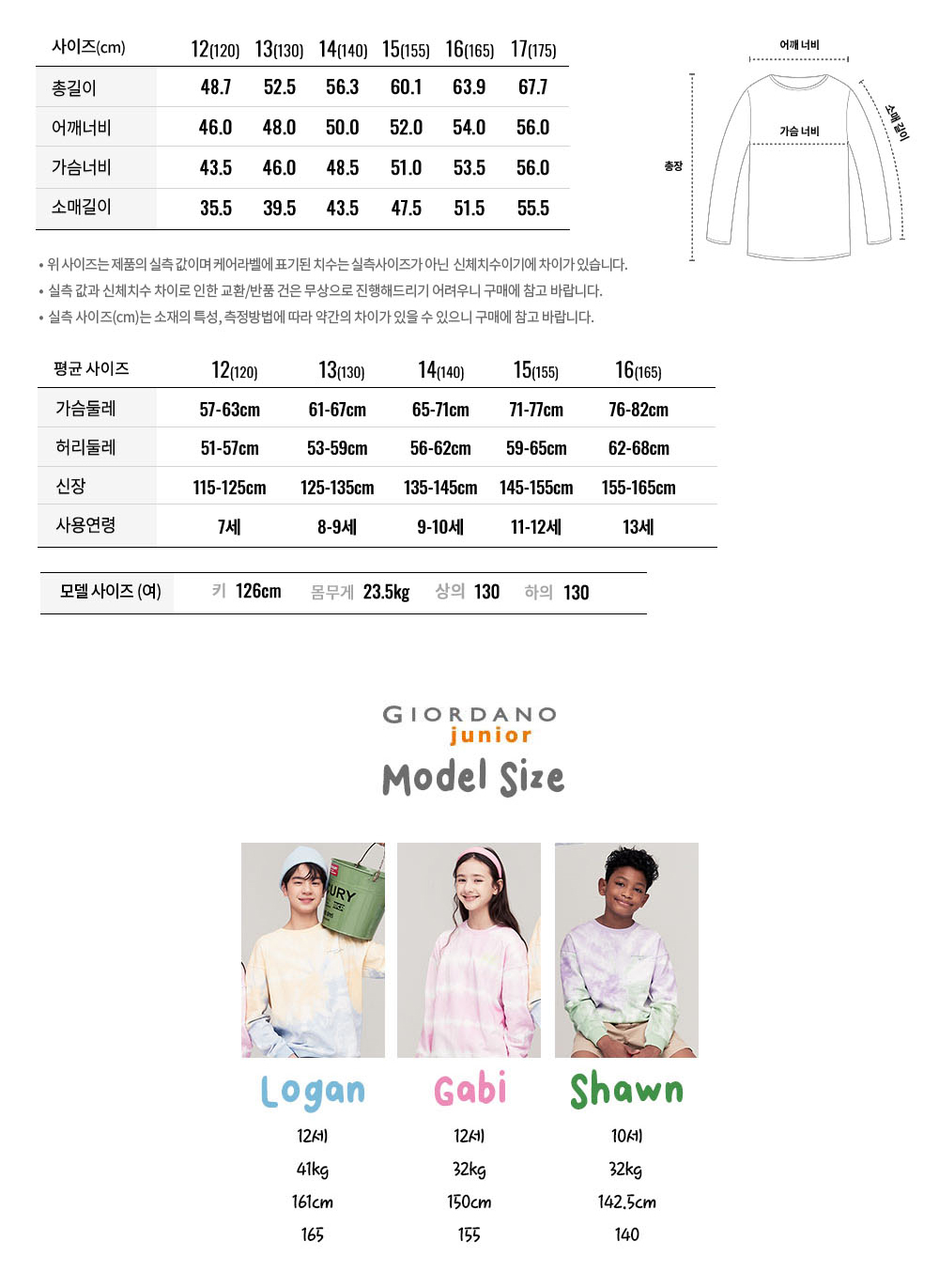 일부 컬러 (#04,05,06,07,09)는 165보다 큰 체형의 어린이를 위해 175 사이즈가 추가되었으며, 성인도 155,165나 175를 착용하여 자녀와 함께 패밀리룩을 연출하실 수 있습니다.