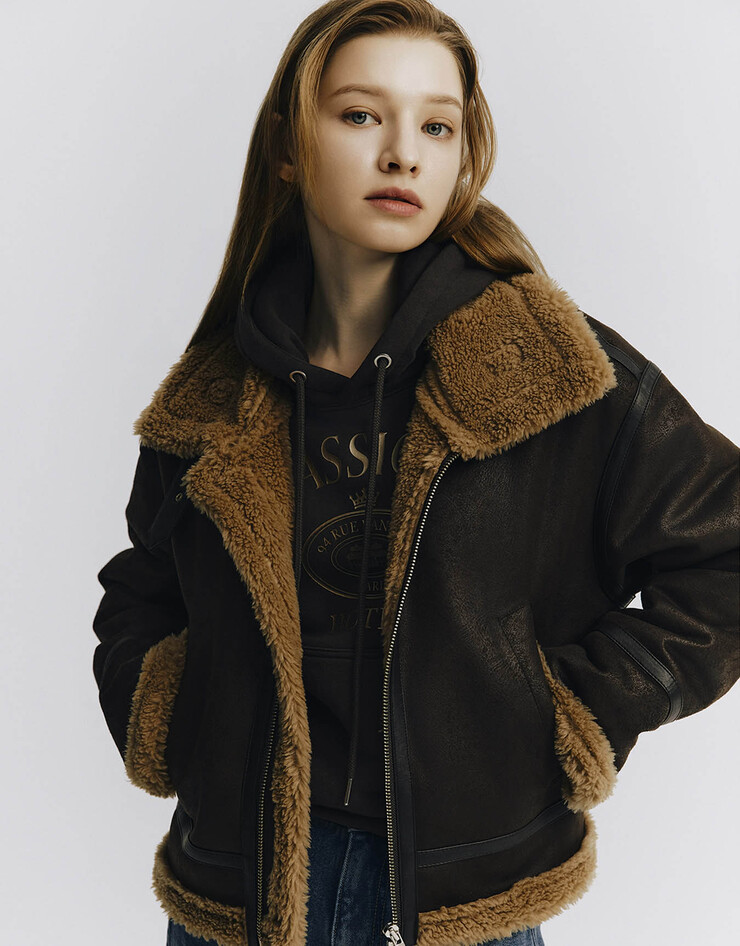 전체적으로 여유감 있는 오버핏의 숏 기장감이 돋보이는 인조 무스탕 자켓입니다.