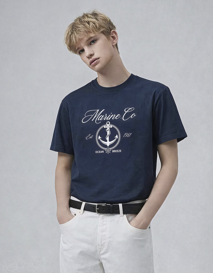 전면에는 마린 무드를 담은 앵커 그래픽과 ‘MARINE.CO’ 타이포 디자인이 포인트로 들어가 있으며, 컬러마다 다양한 배치와 스타일의 그래픽이 적용되어 각각 다른 무드를 연출할 수 있도록 구성되었습니다.