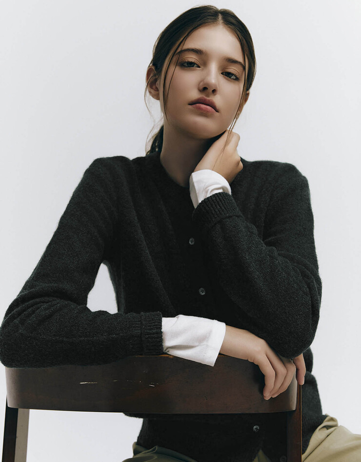 클래식한 크루넥 디자인의 기본 핏 가디건으로